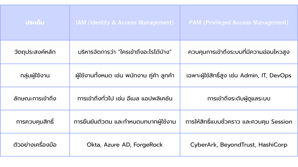IAM ช่วยตอบคำถามว่า “ใครสามารถเข้าถึงระบบใดได้บ้าง” ส่วน PAM ช่วยตอบคำถามต่อมาว่า “เมื่อเข้าถึงแล้ว ได้ทำอะไรบ้าง” การใช้งาน IAM เพียงอย่างเดียวจึงอาจไม่เพียงพอในการควบคุมและตรวจสอบการใช้งานระบบสำคัญอย่างละเอียด
